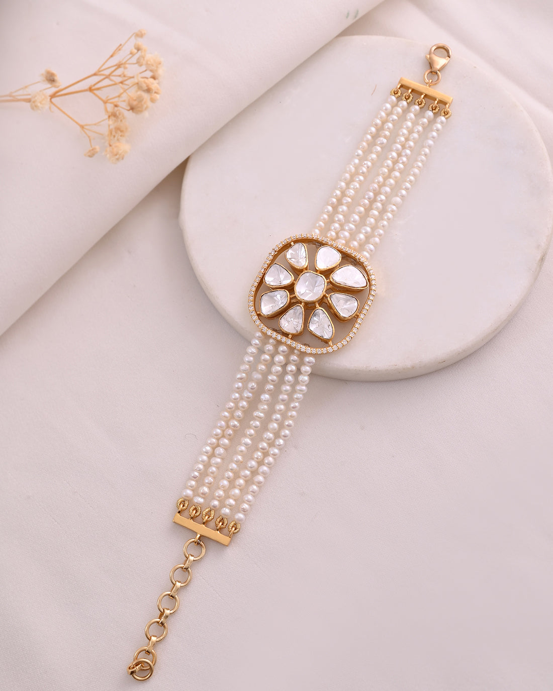 Elevate your wrist with the Polki Pearl Meera Bracelet, a masterpiece that seamlessly blends traditional...