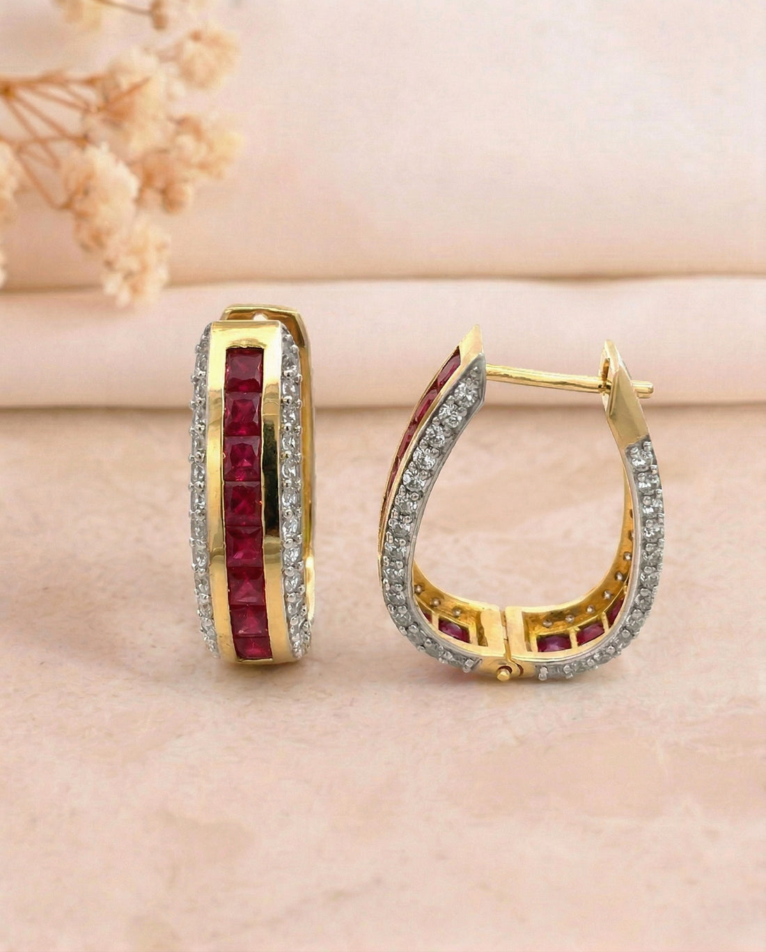 Elegant hoop earrings featuring lustrous Mozambique rubies complemented by sparkling diamonds. Each pair is meticulously...