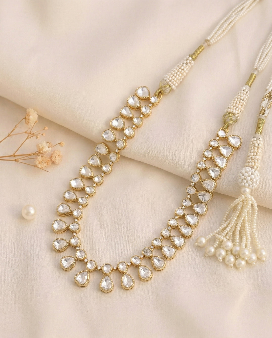 Rivaaz Polki Necklace celebrates timeless elegance with traditional craftsmanship. This piece features authentic polki stones—uncut...