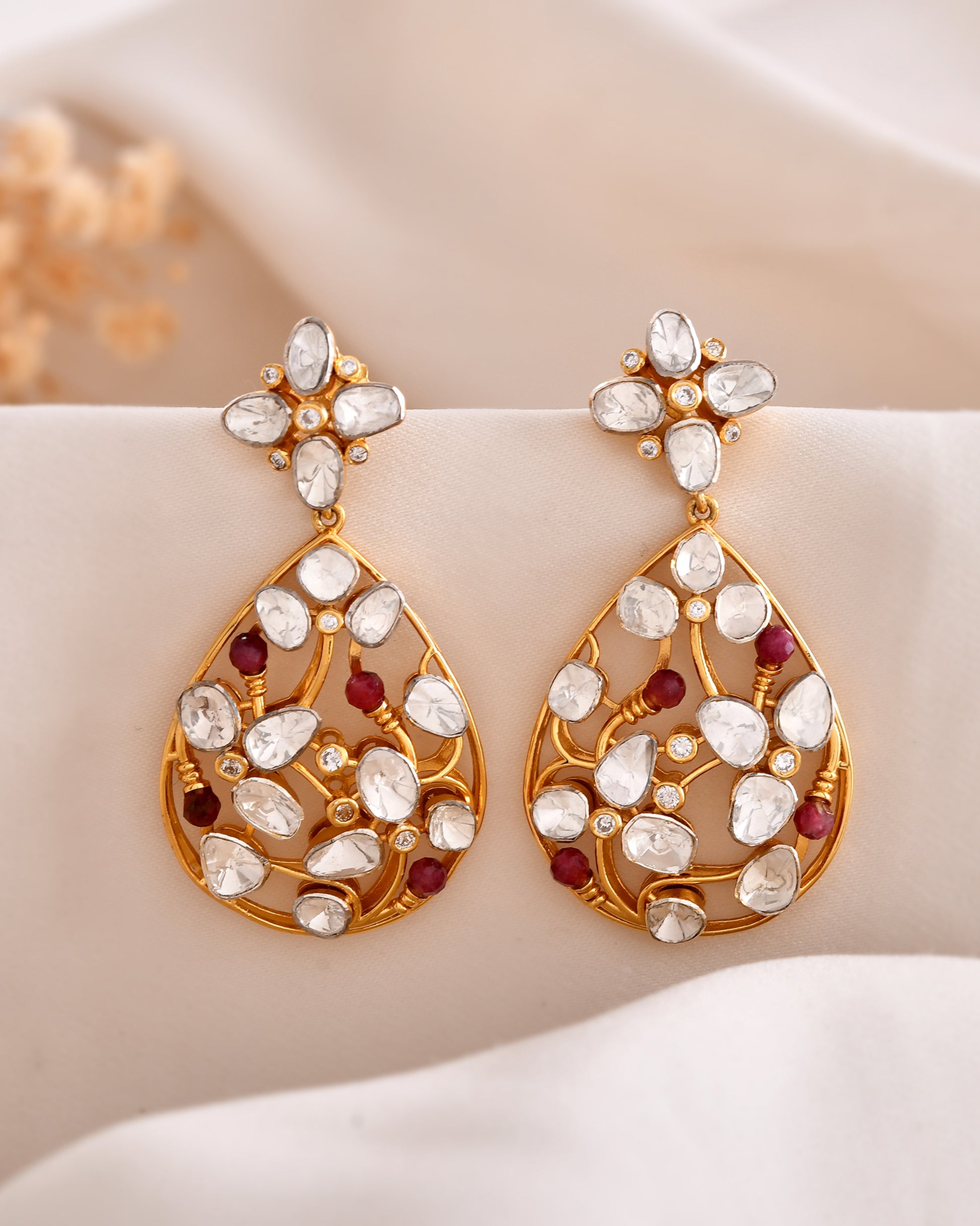 Gulnaar Diamond Polki Earrings showcase the timeless elegance of traditional Indian craftsmanship. Each piece features authentic polki diamonds—uncut, raw stones prized for their natural brilliance and distinctive character. The intricate setting highlights the organic beauty of these gemstones while maintaining the refined aesthetic that defines luxury jewelry. Perfect for celebrations, weddings, or elevating everyday sophistication, these earrings blend heritage artistry with contemporary design. A statement piece that speaks to discerning taste and appreciation for fine craftsmanship.